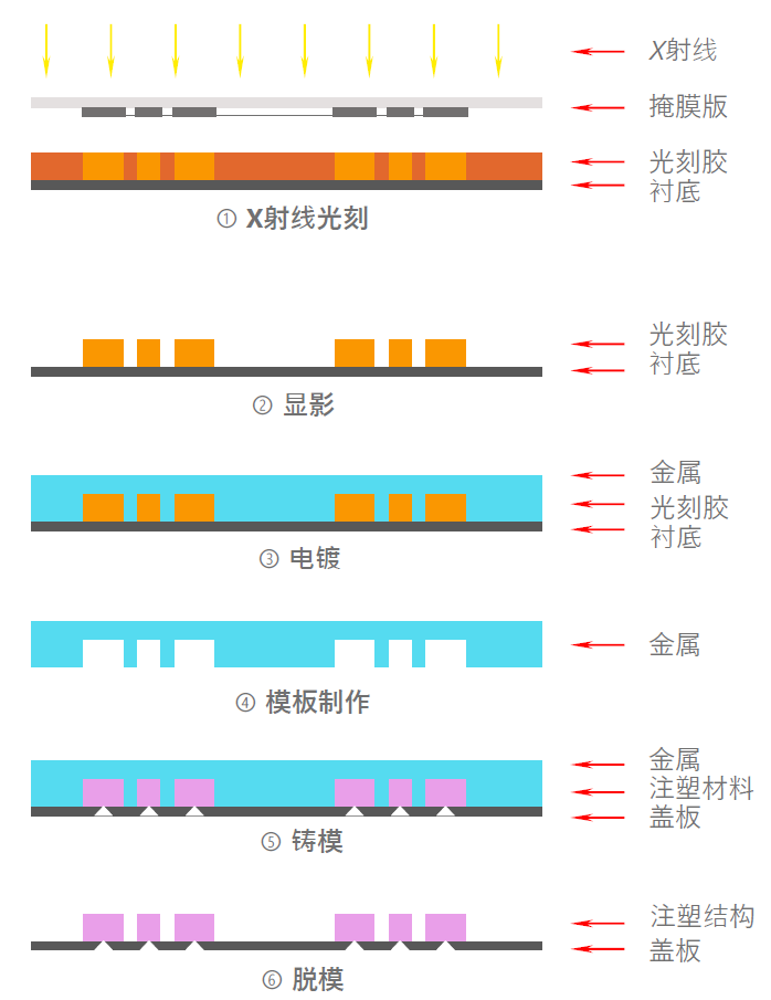 LIGA工藝流程一般包括以下四個(gè)重要步驟:X射線曝光、顯影、電鑄制模、注塑復(fù)制。如下圖所示LIGA一般工藝流程: