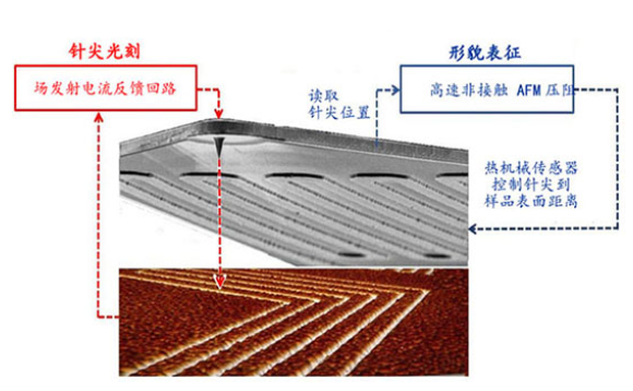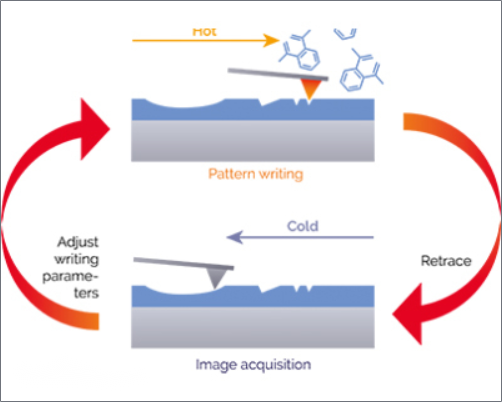 基于熱掃描探針光刻技術(shù)(Thermal Scanning Probe Lithography ),其核心部件是一種可加熱的、非常尖銳的針尖,利用此針尖可以直接進(jìn)行復(fù)雜納米結(jié)構(gòu)的刻寫并且同時(shí)探測刻寫所得結(jié)構(gòu)的形貌。加熱的針尖通過熱作用,直接揮發(fā)局部的抗刻蝕劑,從而實(shí)現(xiàn)對各類高分辨納米結(jié)構(gòu)的制備 。