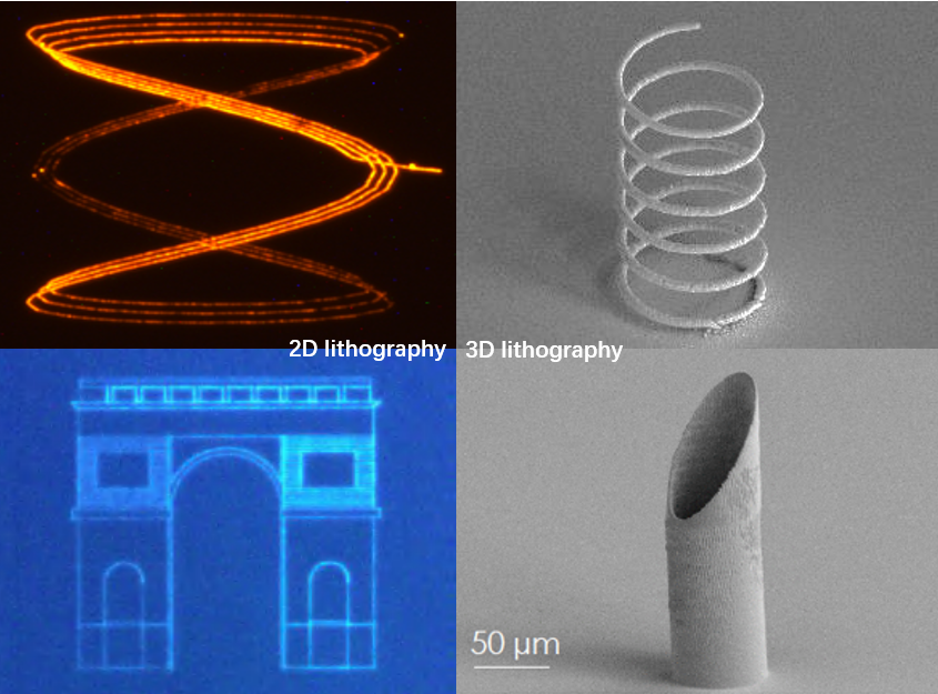 圖5 利用μAM技術(shù)獲得的2D光刻和3D打印結(jié)果