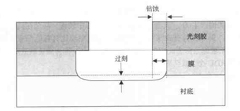 刻蝕偏差是指刻蝕以后線寬或關鍵尺寸間距的變化(見圖1)。它通常是由于橫向鉆刻引起的(見圖2),但也能由刻蝕剖面引起。當刻蝕中要去除掩模下過量的材料時,會引起被刻蝕材料的表面向光刻膠邊緣凹進去,這樣就會產(chǎn)生橫向鉆刻。計算刻蝕偏差的公式如下: