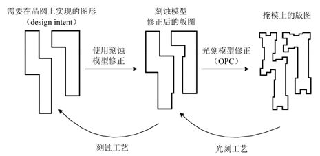刻蝕偏差的大小與很多因素有關:襯底材料、光刻膠上圖形的線寬、刻蝕工藝的參數(shù)等。目前額做法是對版圖上所有的邊緣添加(或減去)一個固定的線寬,被稱為全片刻蝕偏差(global etch bias)。顯然,這樣的做法比較粗糙,設有顧及刻蝕偏差是與光刻膠上的線寬有關的。精確地做法是,建立一個刻蝕的模型,首先對設計的版圖做修正;然后,在做光刻的OPC修正,如圖2(第七章光刻鄰近效應修正與計算光刻 P359 圖7.40)所示??涛g修正可以使用模型,也可以是一些規(guī)則(類似于rules-based OPC)。也有嘗試把刻蝕修正與光學修正合成在一起的。