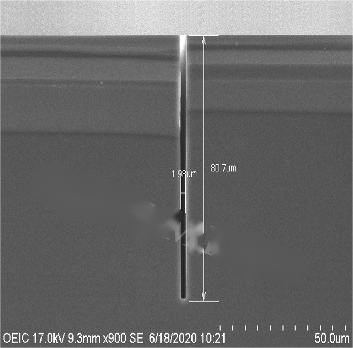 通過對工藝參數(shù)的優(yōu)化,得到了下圖為2μm線寬刻蝕深度80微米,深寬比達40:1。