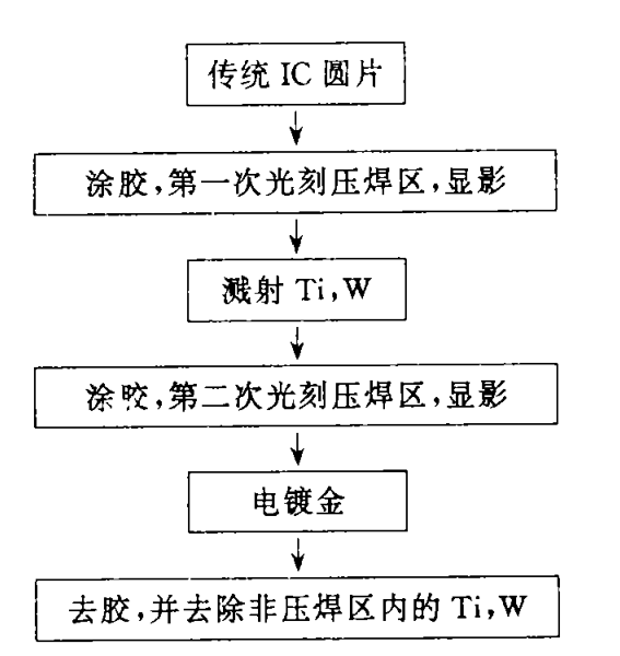 涂膠、光刻、顯影、去膠、濺射等同傳統(tǒng)的集成電路制造工藝是相同的,集成電路制造廠家都具備這些工藝。制作凸點(diǎn)的關(guān)鍵技術(shù)是電鍍金。