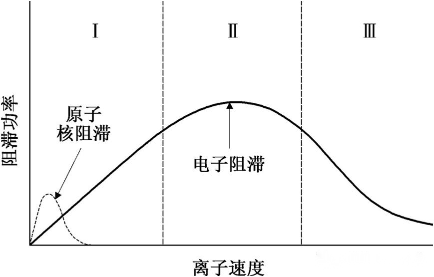 其中,Sn為原子核阻滯力;Se為電子阻滯力。圖1說(shuō)明了阻滯機(jī)制,圖2則顯示了阻滯力與離子速率的關(guān)系。