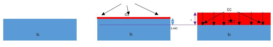 微納加工氧化工藝是在高溫下,襯底的硅直接與O2發(fā)生反應(yīng)生成SiO2,后續(xù)O2通過SiO2層擴散到Si/SiO2界面,繼續(xù)與Si發(fā)生反應(yīng)增加SiO2薄膜的厚度,生成1個單位厚度的SiO2薄膜,需要消耗0.445單位厚度的Si襯底;